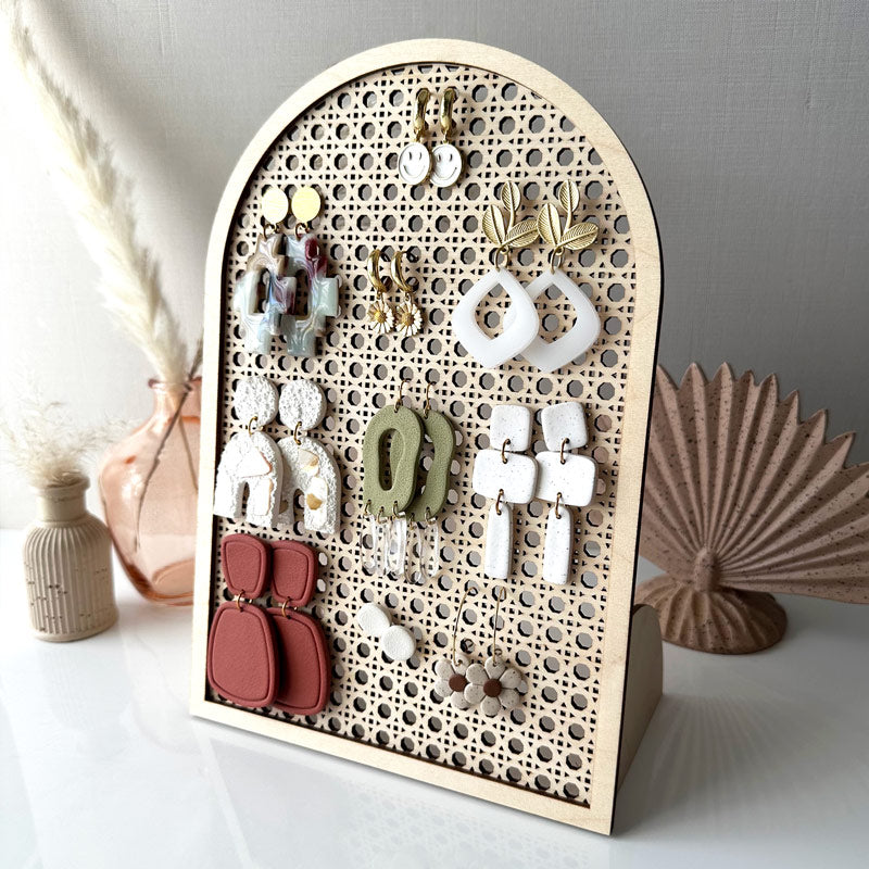 The large earring stands measures 10"H x 6.75"W with the base feet extending 3.25" from the back of the stand.