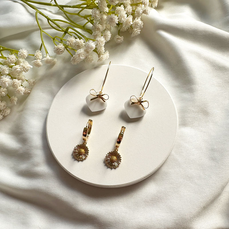 All earrings in this collection have been made by hand, with the exception of the Gold Daisy Huggies which have been hand-assembled. Please allow for minor imperfections and slight variations from the pictures.