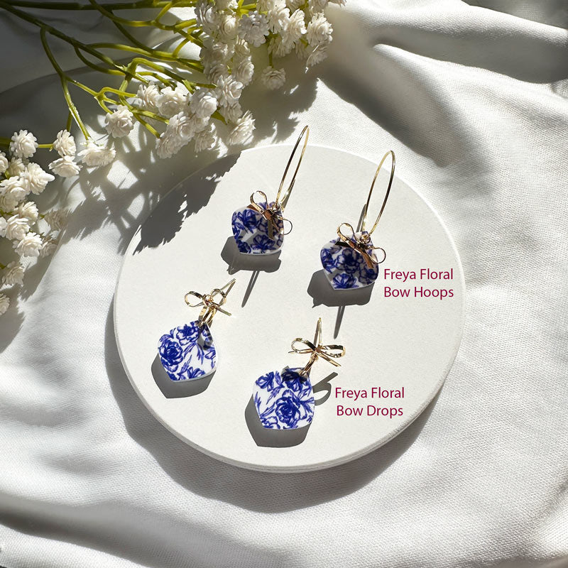 The Freyas are all made with gold plated brass hoops, all bow stud tops and charms are gold plated brass. All findings are hypoallergenic.