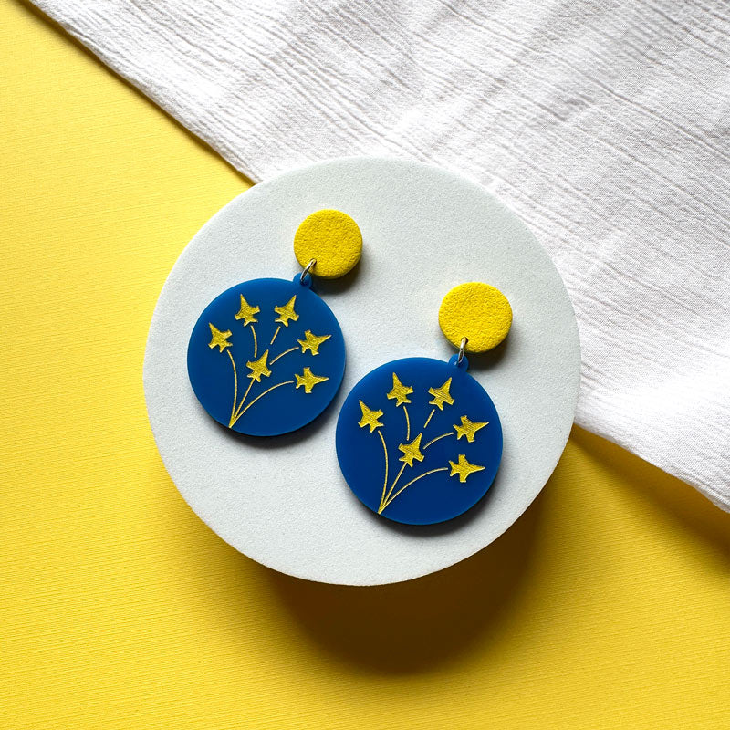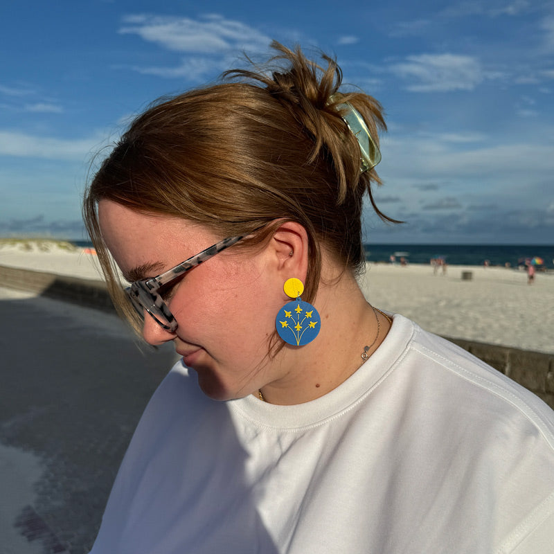 All earrings in this collection are made with nickel free, hypoallergenic, pure titanium posts or nickel free, silver plated brass hoops. Every earring is painted by hand with two coats of yellow for the accents.