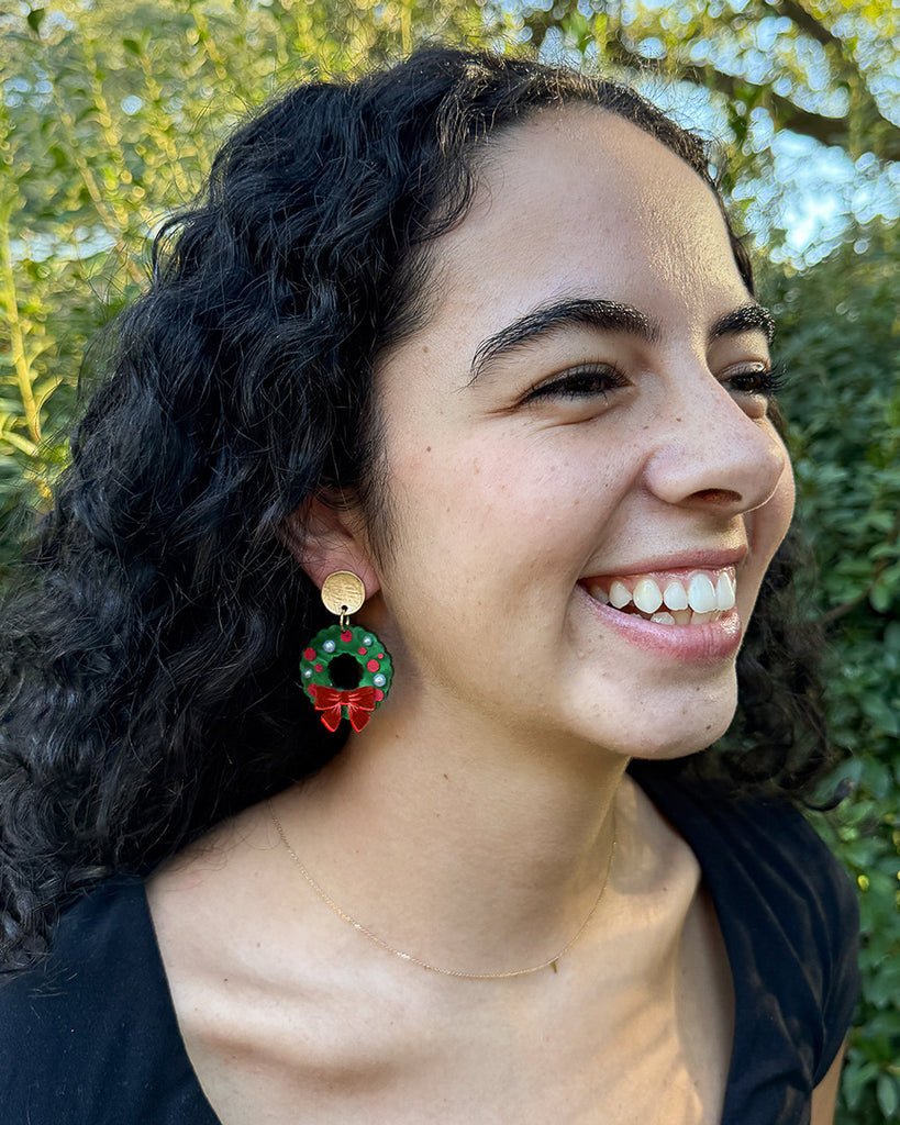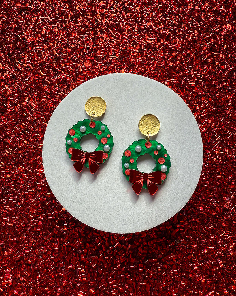 Pearly Wreath Dangles offer a delicate design featuring green wreath shapes accented with red mirror bows and pearl details for a refined touch. Crafted with hypoallergenic stainless steel posts, these lightweight earrings ensure comfortable wear for sensitive ears throughout the day. Ideal for adding subtle elegance to any outfit.