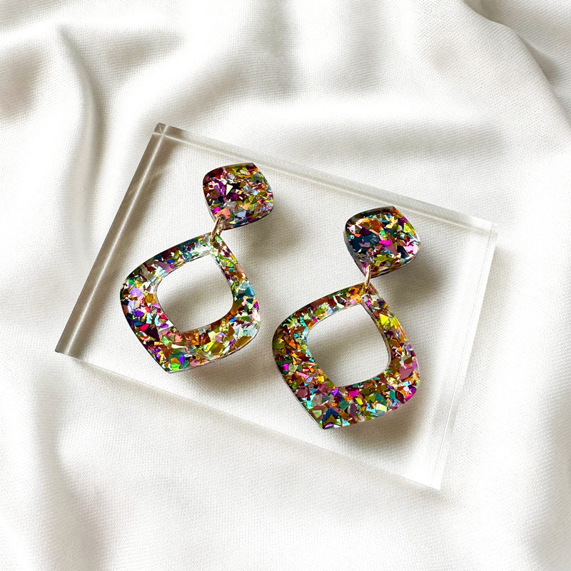 The Party Glitter Collection features lightweight handmade acrylic dangles with a pastel glitter flakes. These unique earrings feature hypoallergenic titanium posts for secure and comfortable wear.