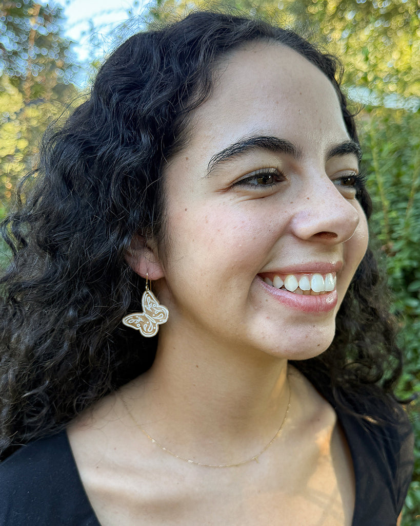 These handmade Gingerbread Butterfly Dangles feature lightweight pearlescent acrylic that shimmers beautifully, mimicking the look of tasty gingerbread cookies. Each pair is carefully crafted for comfort and durability, finished with hypoallergenic, gold-plated stainless steel hooks to ensure a secure and skin-friendly wear. Perfect for adding a subtle festive charm to any outfit.