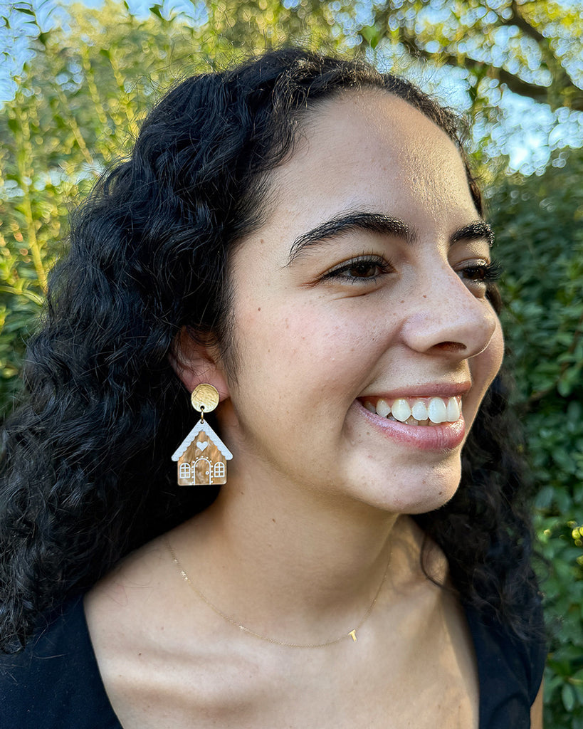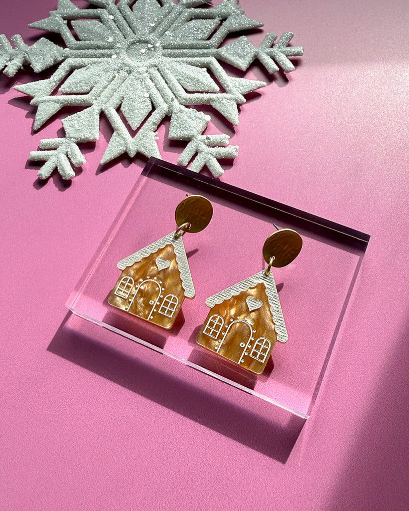 The Gingerbread House Dangles are handcrafted from lightweight pearlescent acrylic, featuring delicate hand painted details for a refined finish. These neutral-toned earrings offer versatile wearability from Christmas through the winter season. Designed with hypoallergenic stainless steel posts, they ensure comfort and safety for sensitive skin. Perfect for adding a subtle festive touch to your holiday outfits.