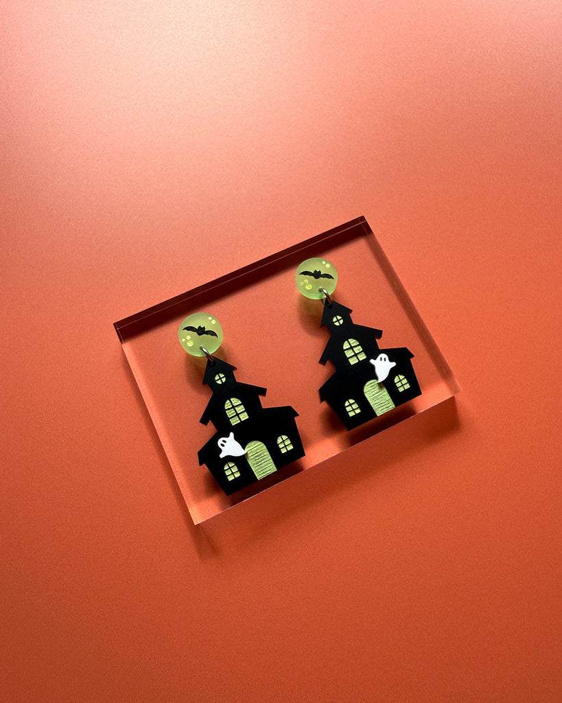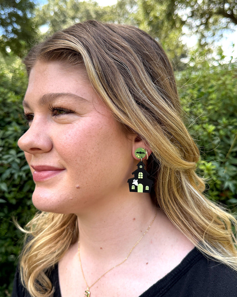 Add a touch of spooky charm with these Haunted House Dangles featuring eerie ghosts and a glowing moon crafted from glow-in-the-dark acrylic. Designed for comfort and durability, they use hypoallergenic titanium posts and tarnish-resistant stainless steel jump rings, perfect for sensitive ears and long-lasting wear. Embrace the Halloween spirit with style and safety.