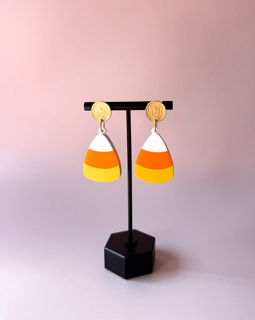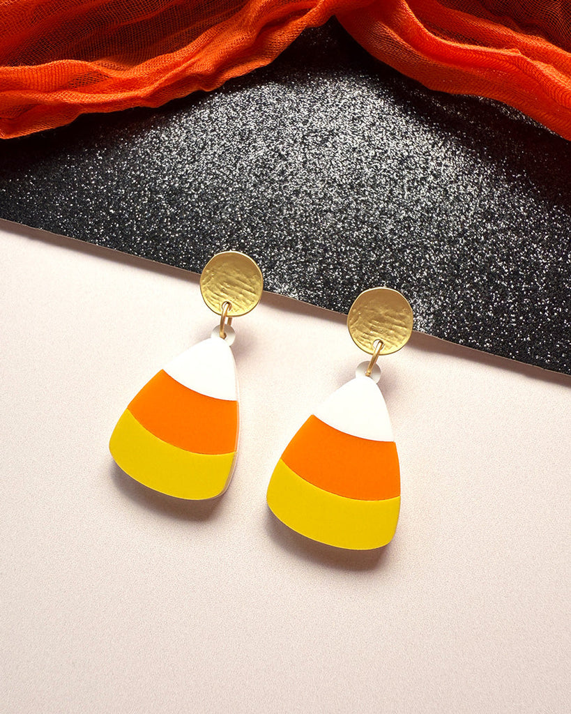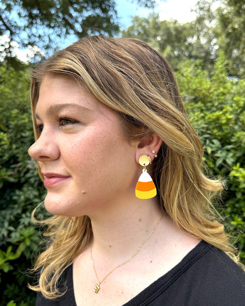 Add a pop of festive fun with these Matte Candy Corn Dangles! Crafted from lightweight acrylic, they’re easy to wear all day while the matte gold tops and hypoallergenic stainless steel posts keep your ears comfy and stylish. Perfect for celebrating the season with a playful twist.