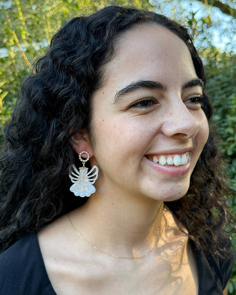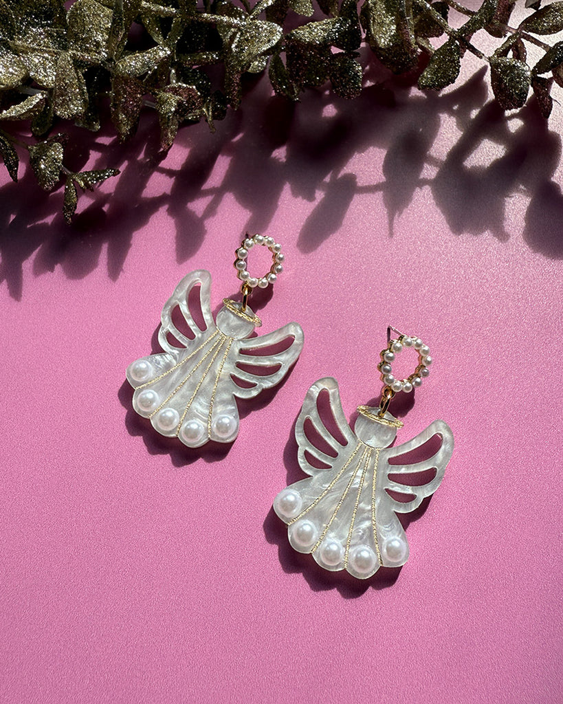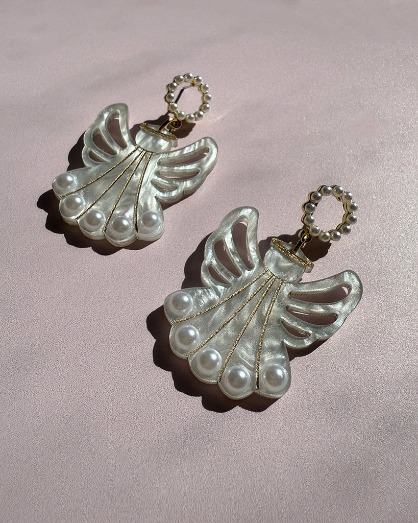 The Pearly Angel Dangles feature lightweight pearlescent acrylic crafted into elegant angel shapes, paired with classic circle pearl tops. Designed with hypoallergenic sterling silver posts, these earrings provide both comfort and durability, making them suitable for sensitive ears. Combining refined materials and thoughtful construction, they offer a sophisticated accessory option for everyday wear or special occasions.