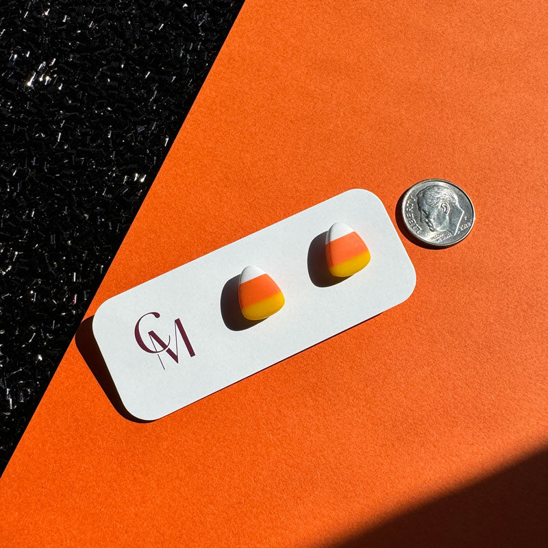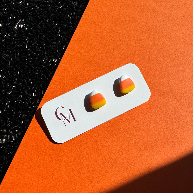 Indulge in these handmade Candy Corn Studs, crafted from lightweight and durable polymer clay. Designed with easy-to-wear nickel-free titanium posts, they're perfect for all-day wear and add a sweet touch to your fall and Halloween outfits! (Disclaimer: May cause cravings for more candy corn.)