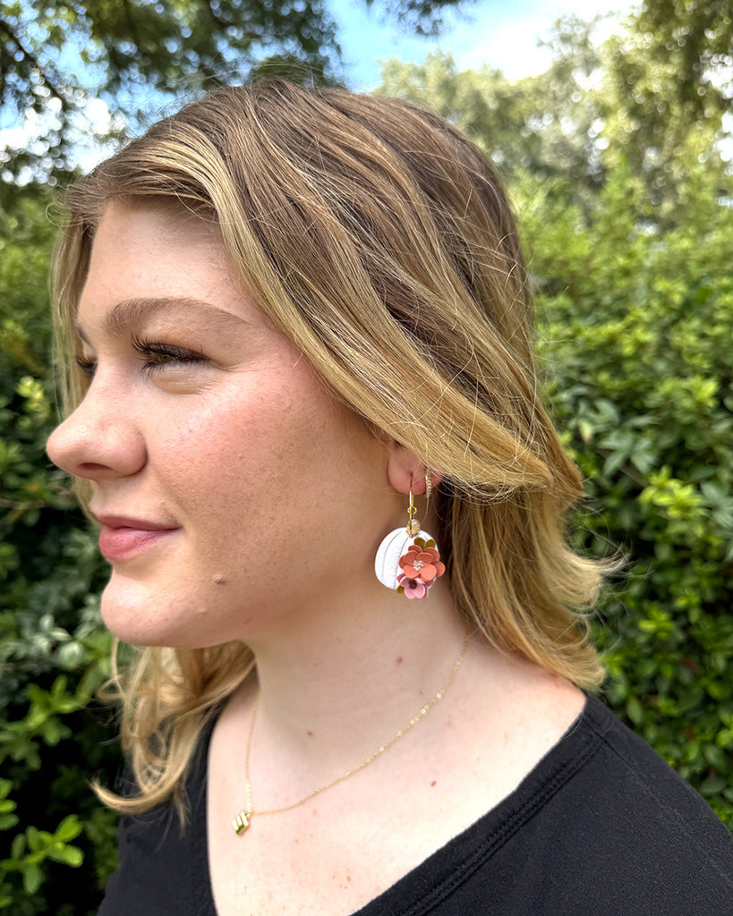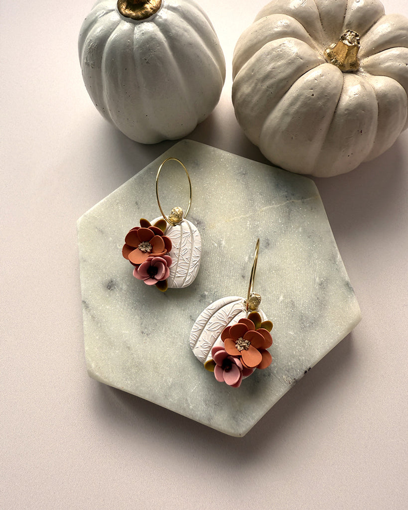 Add a dash of autumn whimsy with these handmade Floral Pumpkin Hoops! Lightweight and delicately crafted from polymer clay, they bring a charming, feminine touch to your fall wardrobe. Plus, their hypoallergenic gold-plated brass hoops mean you can wear them all day without a worry—because pumpkin spice isn’t the only thing that should sparkle this season!